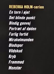 ”Monster” er bind nummer 11 i serien om drabsefterforsker Rebekka Holm. De foregående hedder: